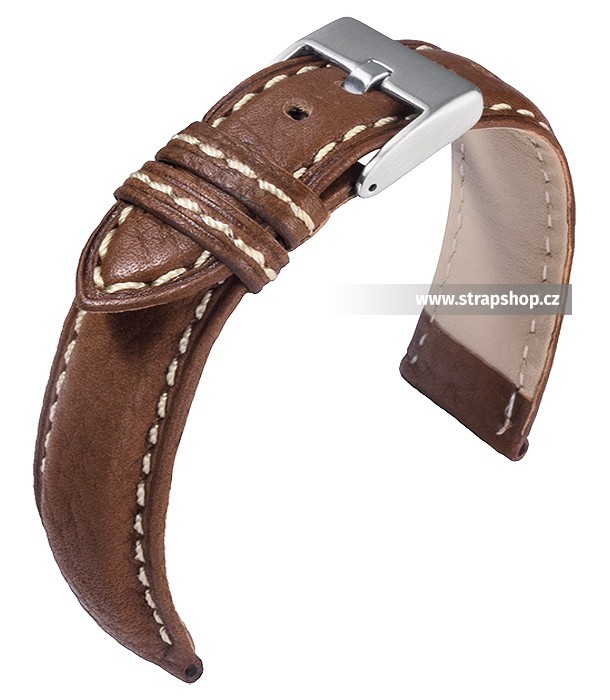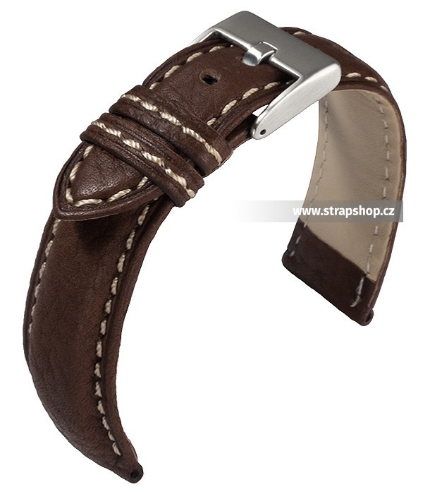 Polstrovaný řemínek hovězí kůže v klasických barvách. Výrazné stehování včetně poutek dává řemínku sportovní charakter. Spona z leštěné nerezové oceli.
